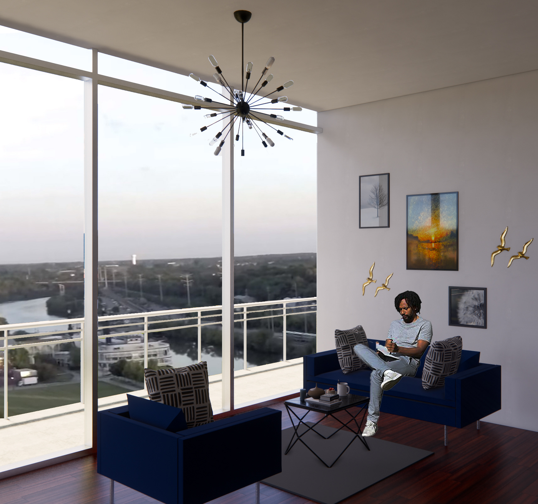 The 20-Story mixed-use high-rise embraces the future of design while enhancing community in the Elgin area. The tower has a sense of transparency that allows a more open feel and maximum enjoyment of the views surrounding the site which include the fox river on the west of the site. There are terracotta rain-screen and sunscreen panels depending on the elevation in colors prominent in the downtown area used around the spandrels and o the bottom community floors to incorporate some of Elgin's history into the building. The balconies also serve as shading devices for sustainability purposes.